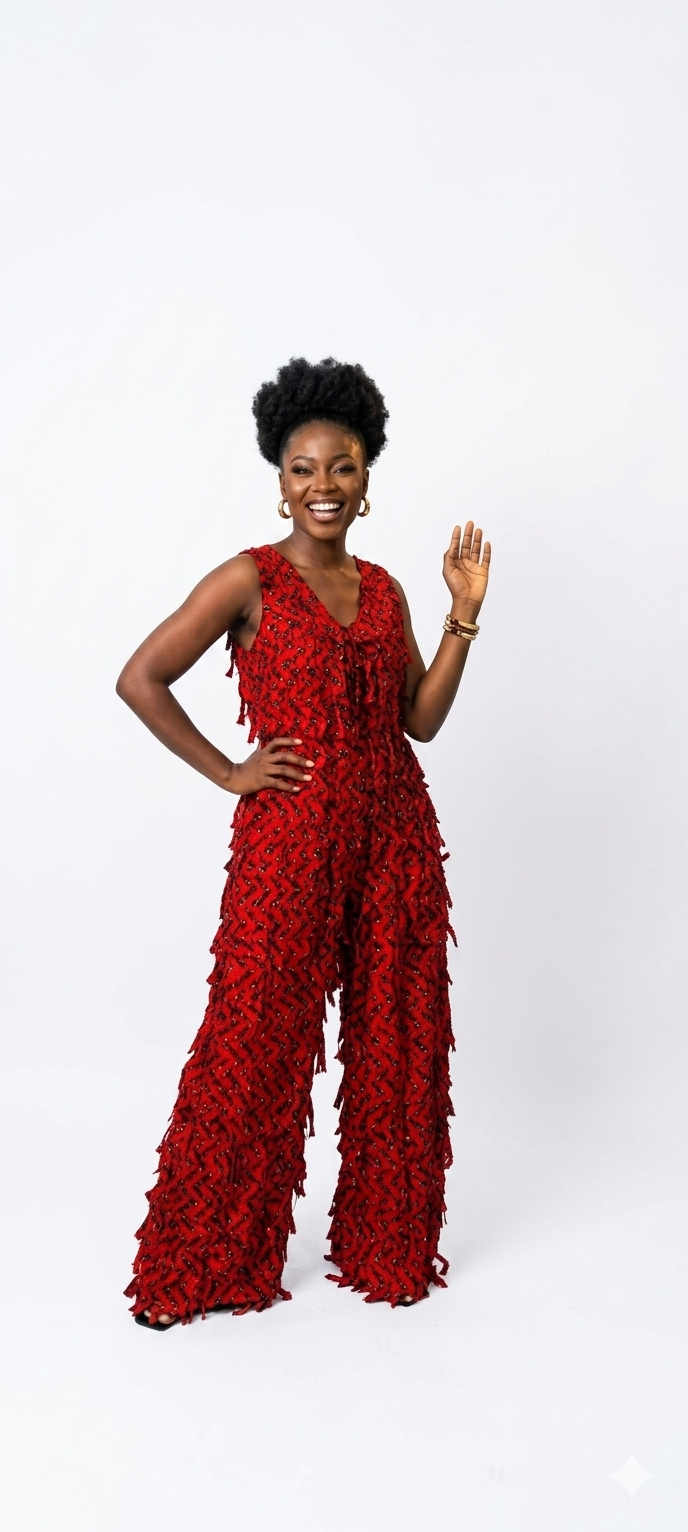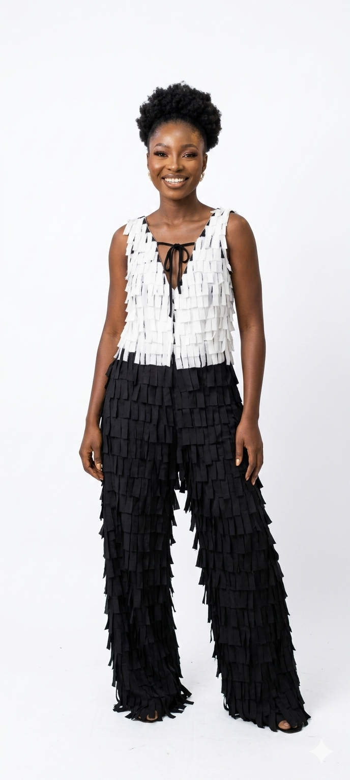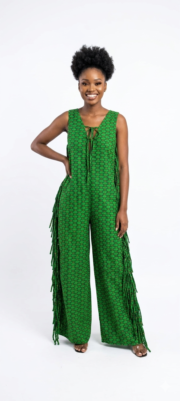 For the woman who isn’t afraid to stand out. These jumpsuits combine bold African prints with playful, tactile fringe Covered in delicate, high-density fringe, this jumpsuit moves with you, creating a shimmering effect.